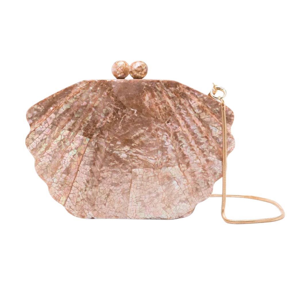 De Isla Clutch met parelmoer is een echte showstopper voor iedereen die van zee-geïnspireerde accessoires houdt. Door de uitgesproken schelpvorm en de glanzende parelmoerstructuur voelt deze tas als een sieraad op zich.