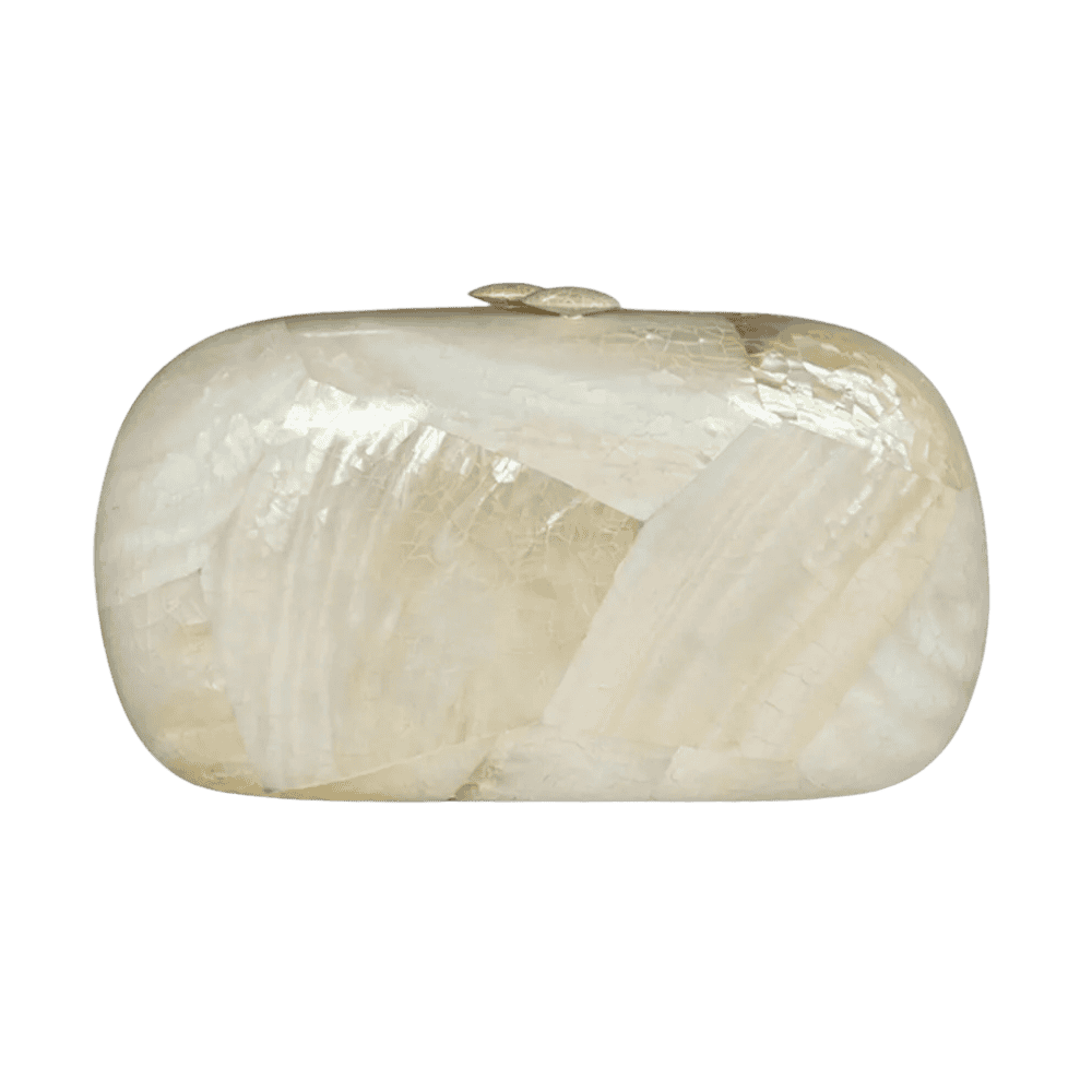 De Serpui Josephine Clutch ziet er uit alsof ze gemaakt is van schelpen. Deze clutch is volledig afgewerkt in een parelmoerachtige afwerking. De zachte glans en lichte schelpstructuur doen direct denken aan zandstranden en het glinsterende binnenste van een oester. Het minimalistische rechthoekige model maakt hem bovendien heel elegant en tijdloos, waardoor hij zowel bij een strandbruiloft als een chique avondjurk gedragen kan worden.