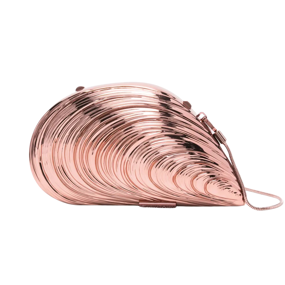 Simhkai Bridget Oyster Clutch heeft letterlijk de vorm en glans van een oesterschelp. De metallic roségouden afwerking doet denken aan parelmoer en reflecteert het licht net als een schelp in de zon. Het golvende reliëf versterkt die oceaan-vibe en maakt van deze tas een echte statement piece. Perfect voor een zomerse bruiloft, een chique avondje uit of een strandfeest.