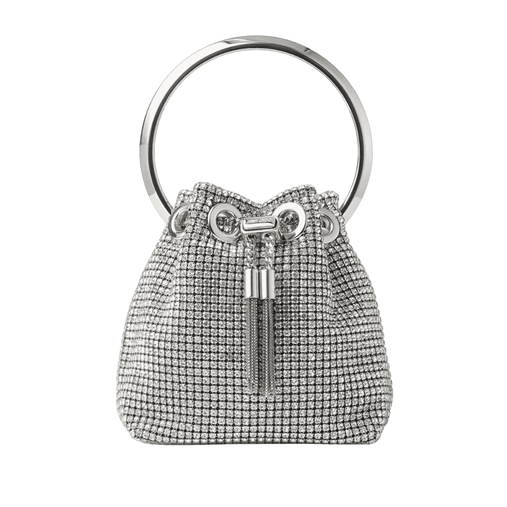 De bucket bag is al jaren een favoriet, maar met de Jimmy Choo Bon Bon krijgt dit model een complete glamour-make-over. De tas is volledig bezet met kristallen en afgewerkt met een opvallende metalen ring als handvat – een detail dat haar meteen een luxe uitstraling geeft.
